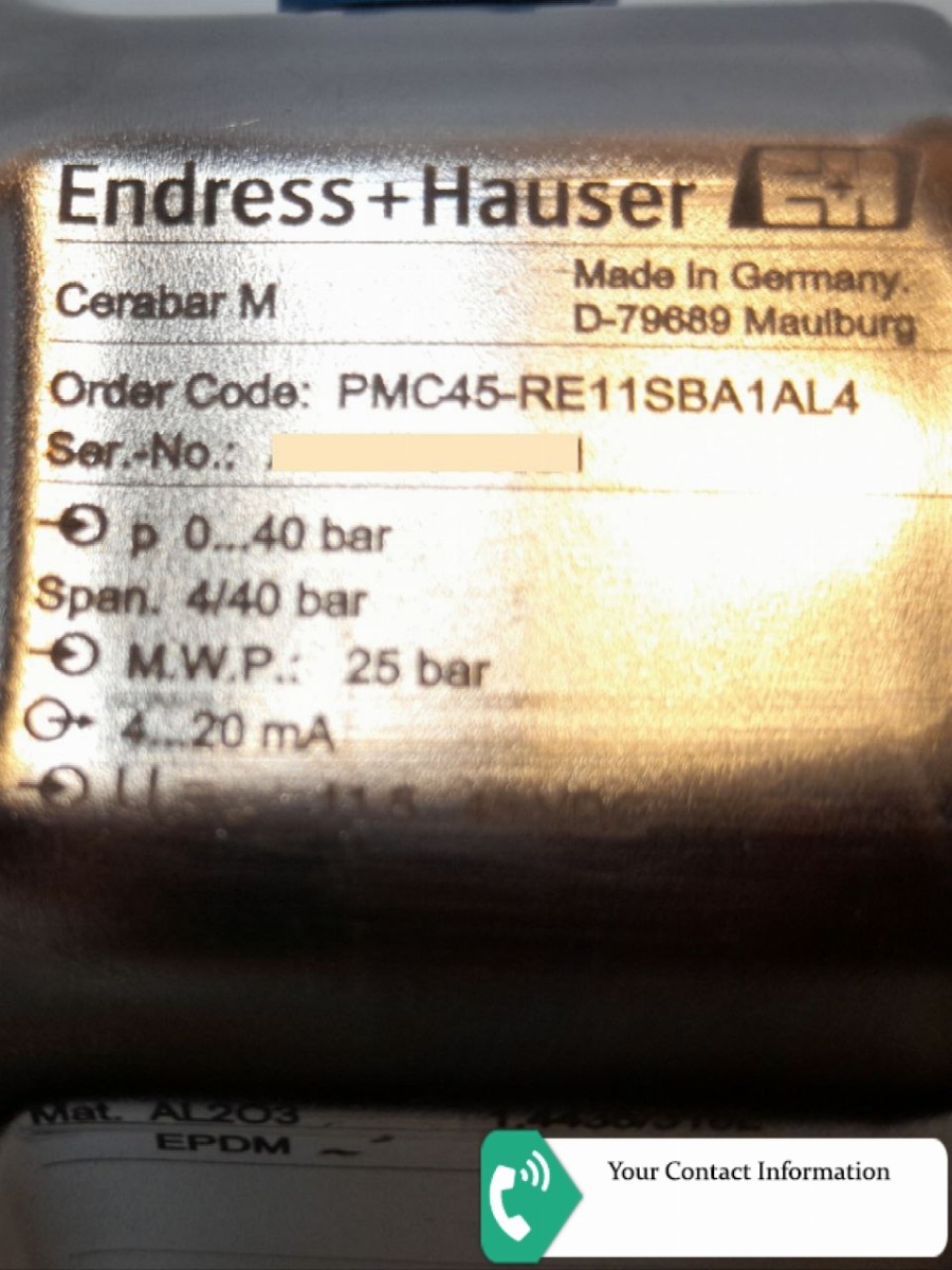 Cerabar M PMC45 PMC45-RE11SBA1AL4 Approval: R = Non-hazardous area Housing; Electrical Connection: E1 = F15 316L Hygiene; gland M20, IP66 Sensor Range; Sensor Overload Limit: 1S = 0...40bar/4MPa/600psi gauge; 60bar/6MPa/900psi Calibration; Unit: B = 0.2% see additional spec. Output; Operating: A = 4-20mA analogue; w/o display Additional Option: 1 = Basic version Process Connection: AL = DIN11851 DN50 PN25 slotted-nut, 316L, EHEDG, 3A with seal HNBR/EPDM Sensor Seal: 4 = EPDM (FDA)