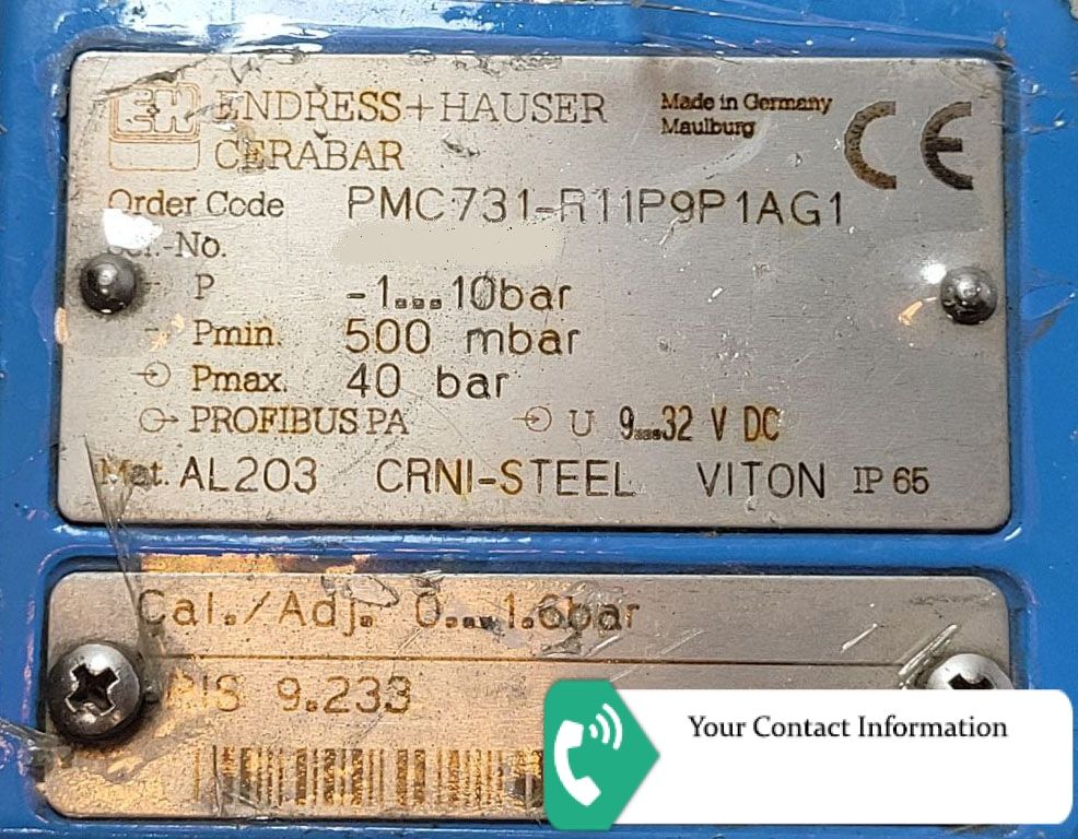 PMC731-R11P9P1AG1 Approval: R = Non-hazardous area Housing; Cable Entry: 1 = Housing Alu with LCD Pg13.5 gland Sensor Range; Sensor Overload Limit: 1P = 0...10bar/1MPa/150psi gauge; 40bar/4MPa/600psi Calibration; Unit: 9 = Adjusted; see additional spec Output: P = PROFIBUS PA Additional Option: 1 = Basic version Process Connection: AG = Thread ISO228 G1-1/2, 316L Ceramic flushm Seal: 1 = FKM Viton