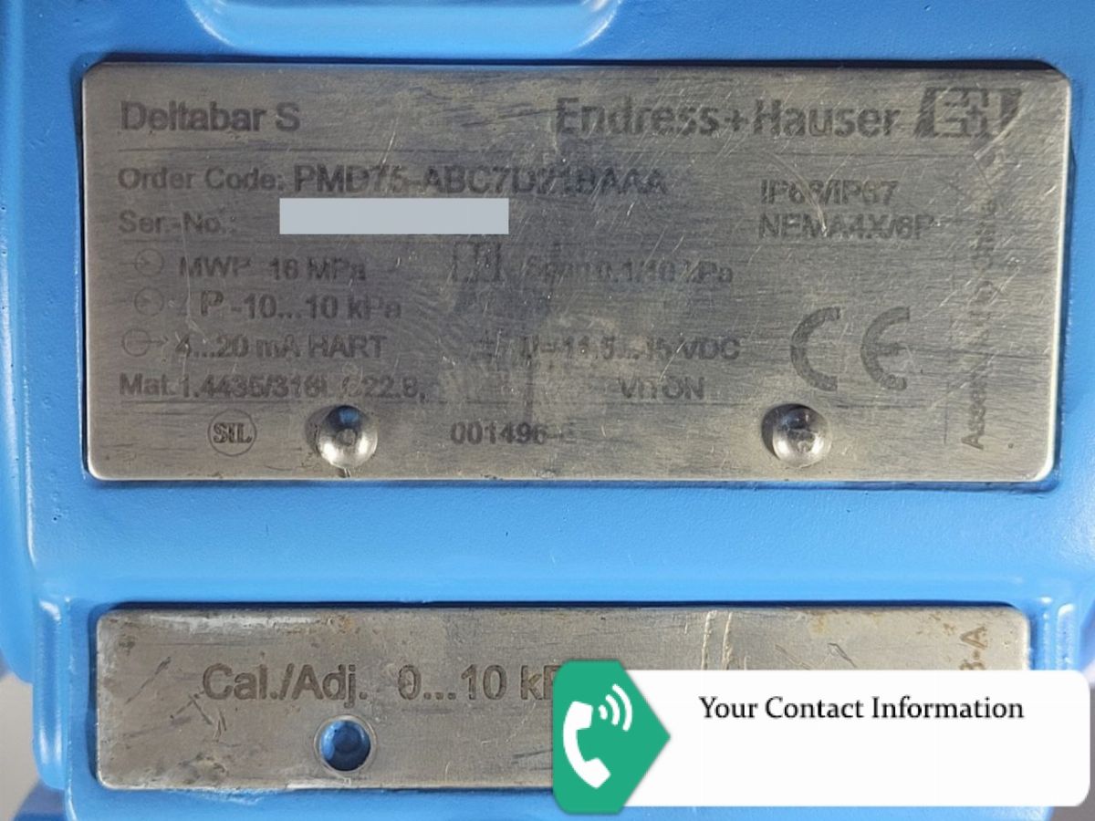 Deltabar S PMD75 PMD75-ABC7D21BAAA Approval: A = Non-hazardous area Output; Operating: B = 4-20mA HART; inside + LCD Housing; Cover Sealing; Cable Entry: C = T14 Alu IP66/67 NEMA6P; EPDM; NPT1/2 thread, T14 = side cover Nominal Range; Cell Material; PN: 7D = 100mbar/10kPa/1.5psi; 316L; 160bar/ 16MPa/2400psi Calibration; Unit: 2 = Nominal range; kPa/MPa Membrane Material: 1 = 316L Process Connection: B = NPT1/4-18 IEC61518 UNF7/16-20, C22.8 incl. 2 valves, 316L Seal: A = FKM Viton Additional Option 1: A = Not selected Additional Option 2: A = Not selected
