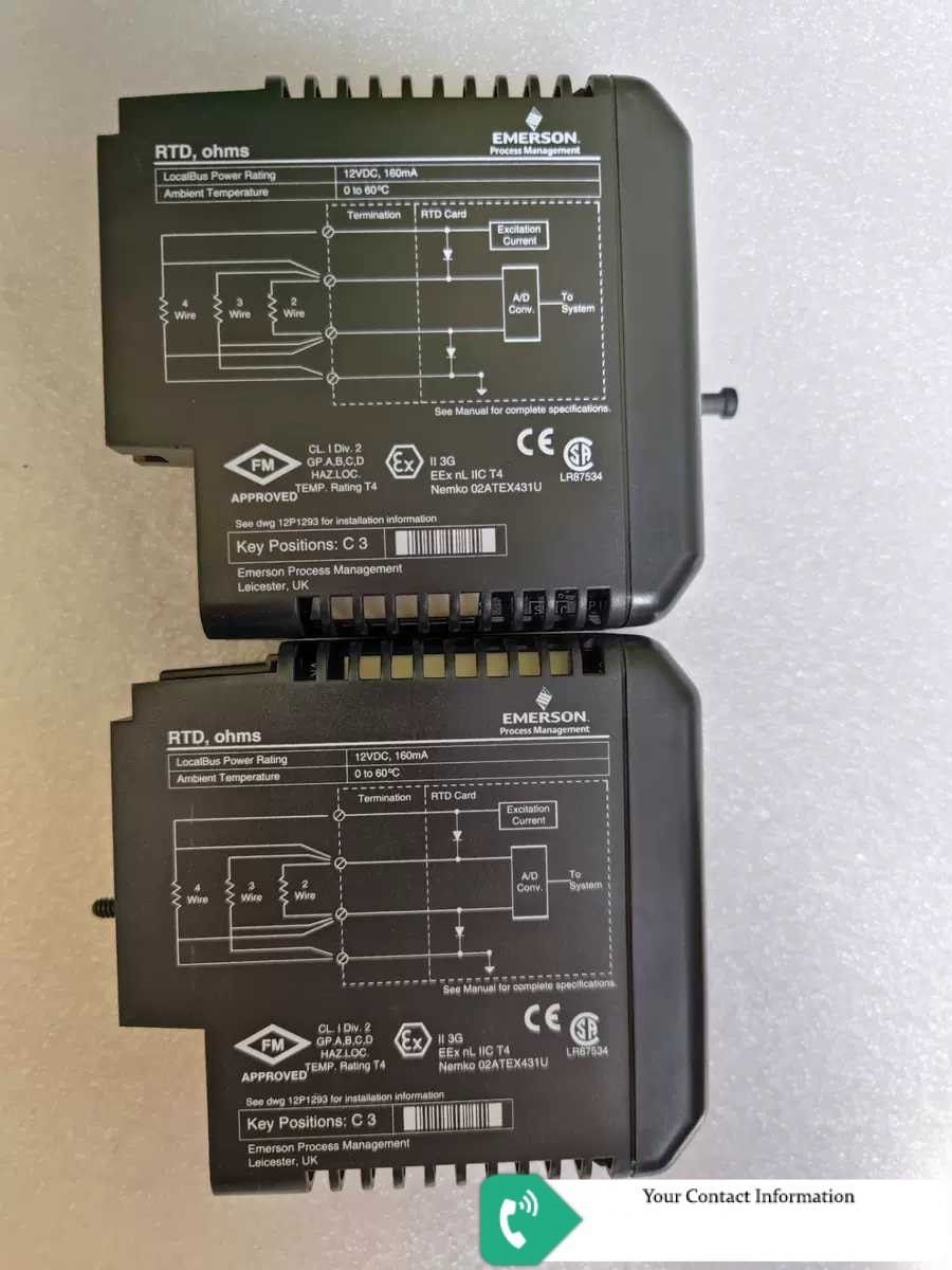 Emerson KJ3002X1-BF1 RTD Card Part Number: D803048X012 LocalBus power rating 12 VDC at 160 mA Field circuit rating 5.5 VDC at 0.6 mA/channel Ambient Temperature 0 to 60o C Shock 10g ½ Sinewave for 11 msec Vibration 1mm Peak to Peak from 5 to 16Hz; 0.5g from 16 to 150Hz